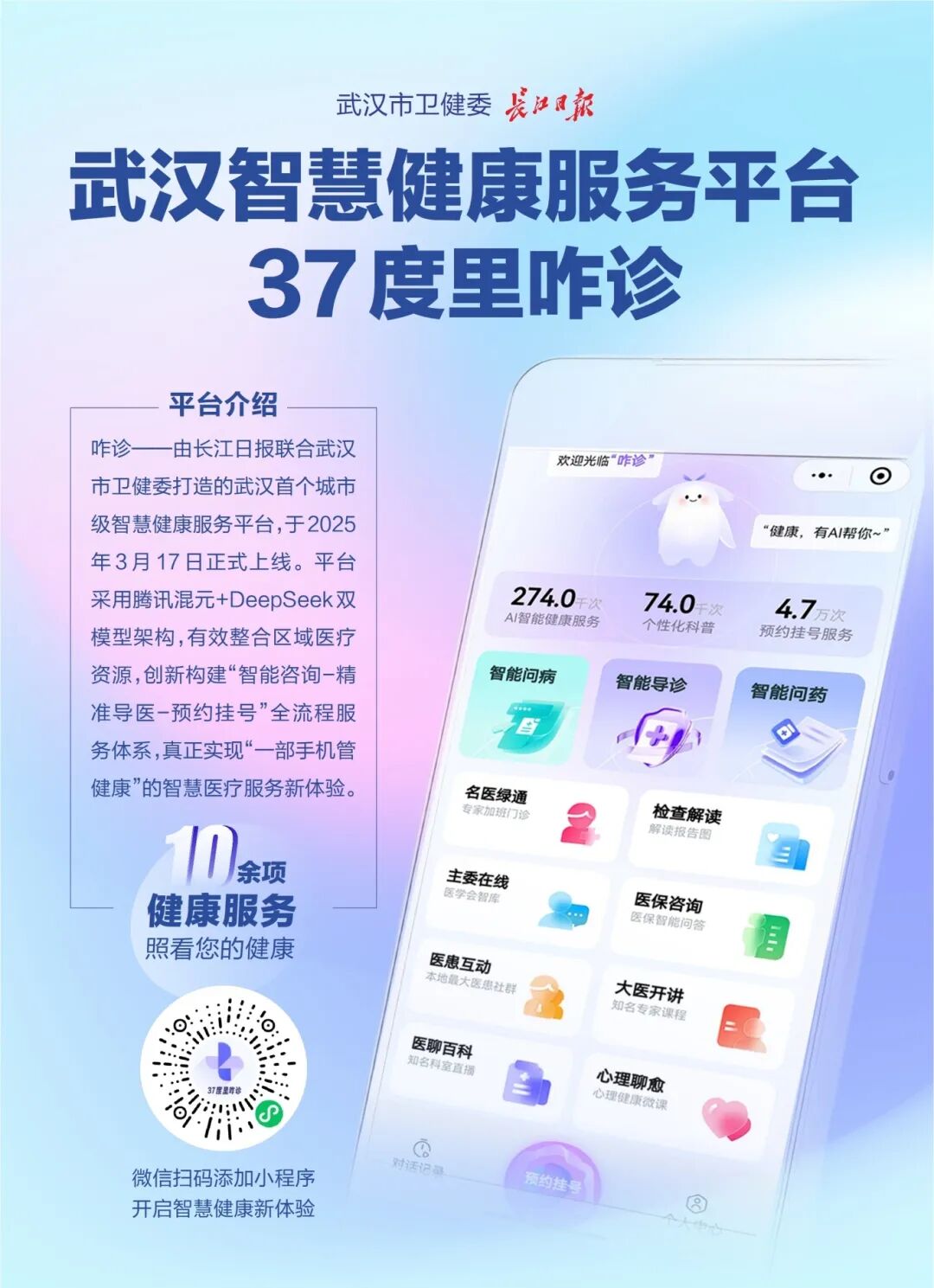 长江日报联合打造的“武汉智慧健康服务平台——咋诊”,通过人工智能技术,平台可实现线上快速问诊、病情初步研判、就医路径指引等功能,减少市民就医等待时间。