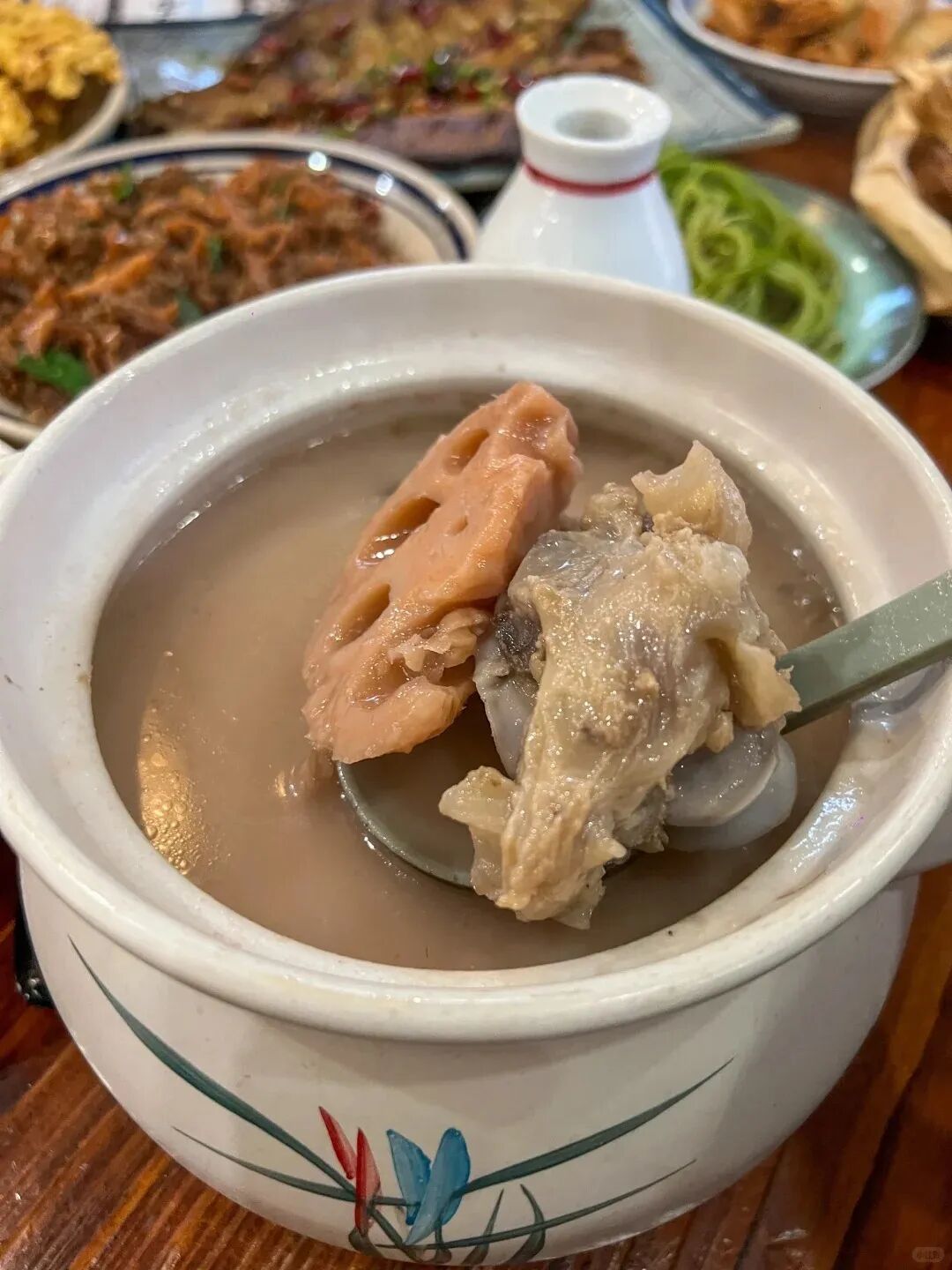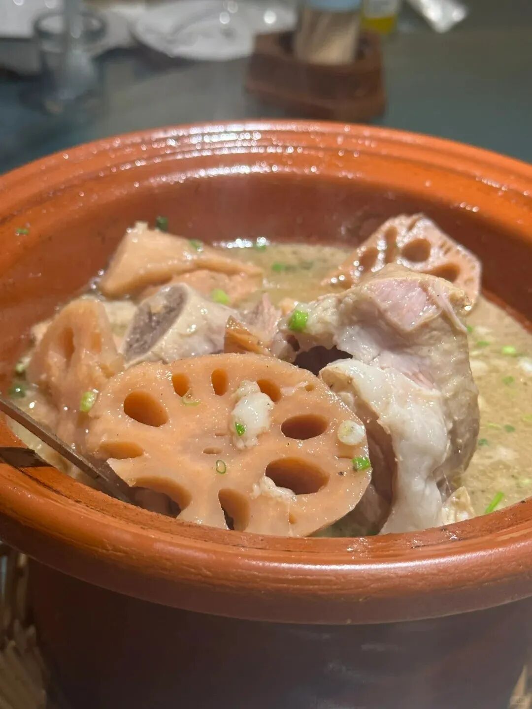 一锅汤慢炖数小时,汤头浓稠,泛着淡淡的红色,藕块炖得粉糯,筷子一夹就颤巍巍,送进嘴里,轻轻一抿便化在舌尖。