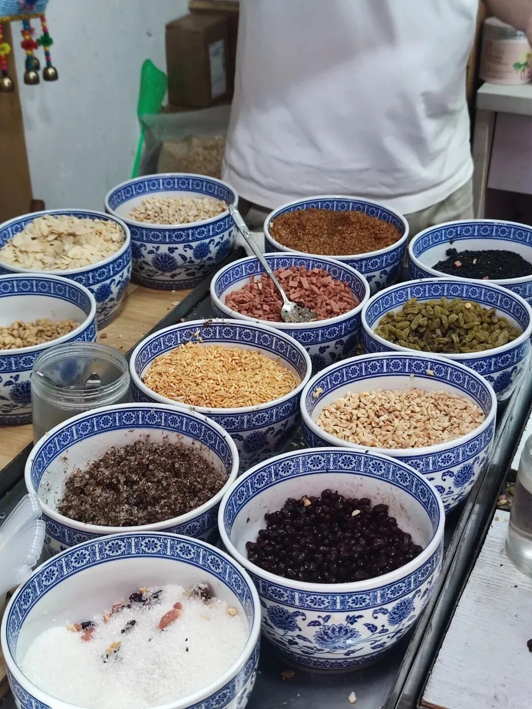再撒上黑芝麻、红糖,铺上葡萄干、腰果等十多种小料,不过几分钟,一碗配色鲜亮的藕粉便端到面前。