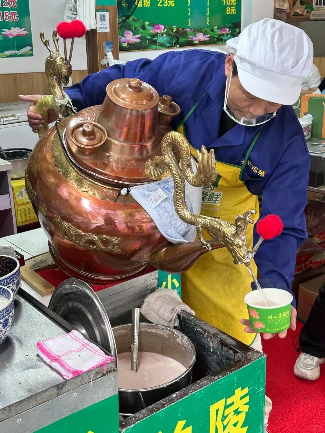滚烫的开水从铜壶细长的壶嘴高高泻下,与藕粉相拥的瞬间,老板快速搅动,勺子翻飞间,藕粉渐渐变得清亮剔透。