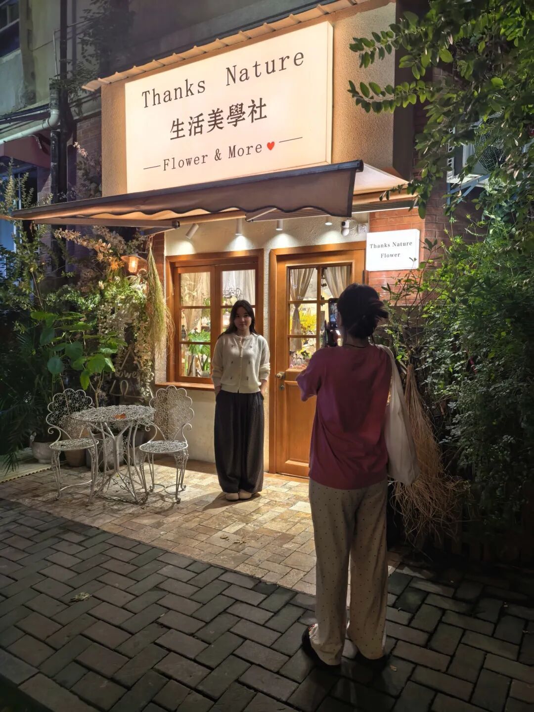 整个假期期间,即使花店晚上打烊了,店主也仍然会为大家保留明亮的灯火。门前还摆放了白色铁艺桌椅,方便市民游客取景。