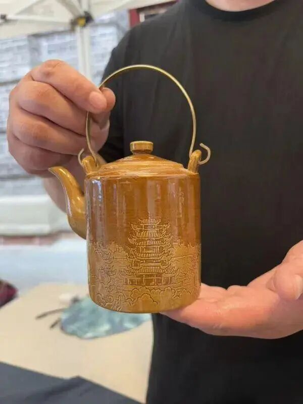 湖畔陶野马口窑工作室主理人刘双的摊位上,一个绘有黄鹤楼图案的茶壶吸引了不少游客。