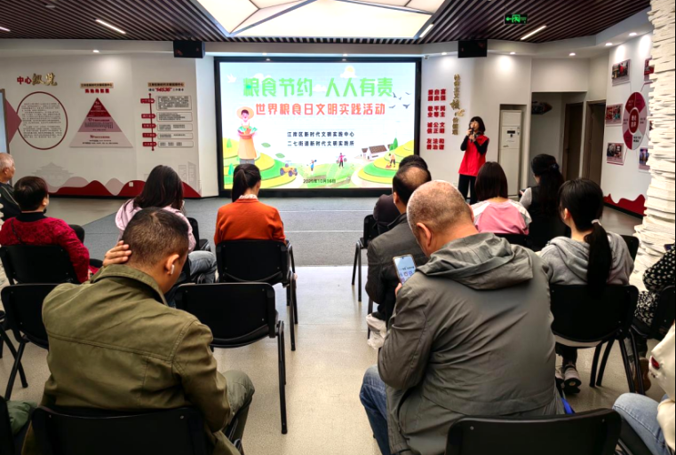 区委宣传部在区新时代文明实践中心开展“粮食节约,人人有责”世界粮食日主题活动,通过宣传粮食安全知识、“文明餐桌”理念,倡导践行“光盘行动”,引导居民群众树立爱粮护粮意识,形成文明节粮风尚。