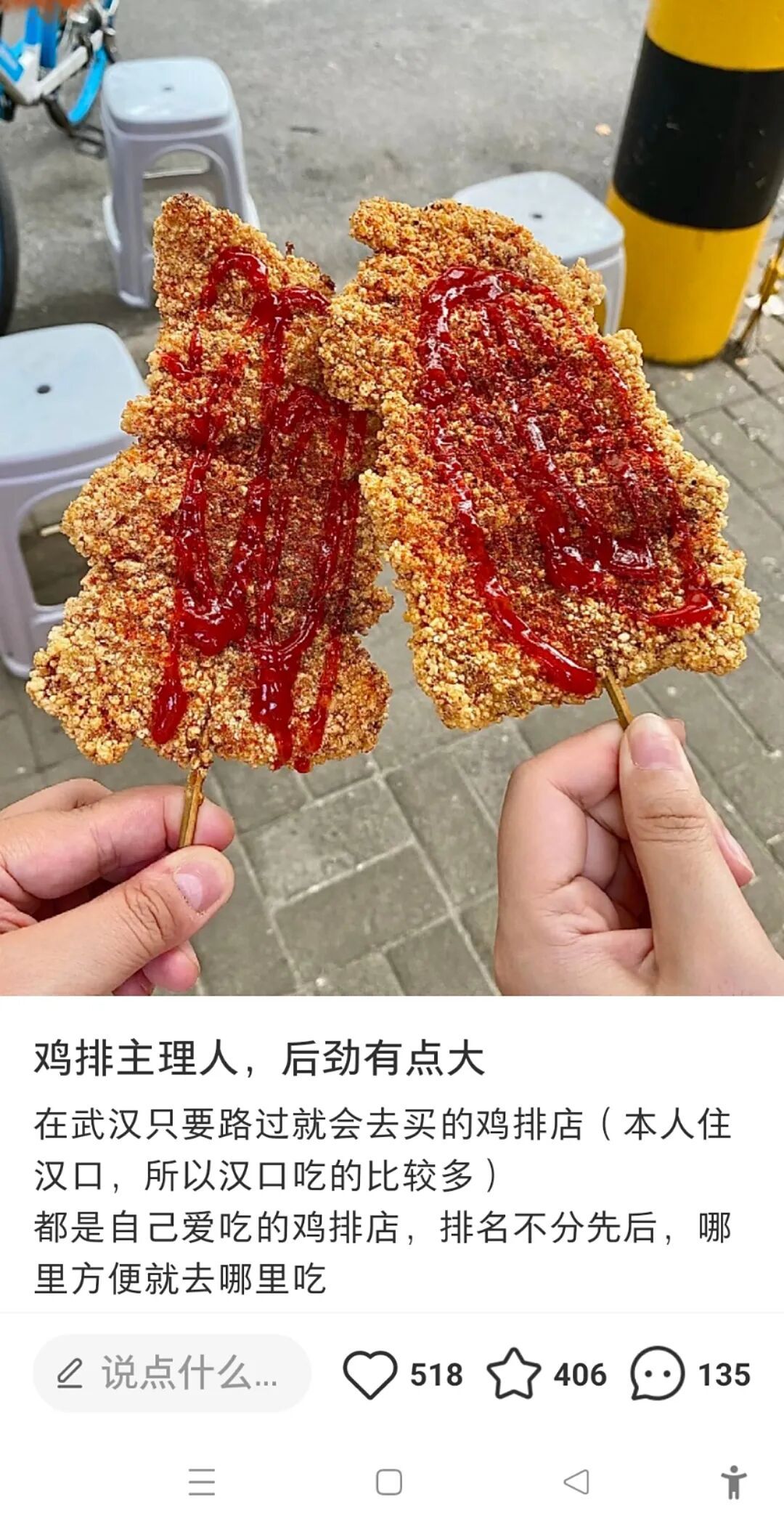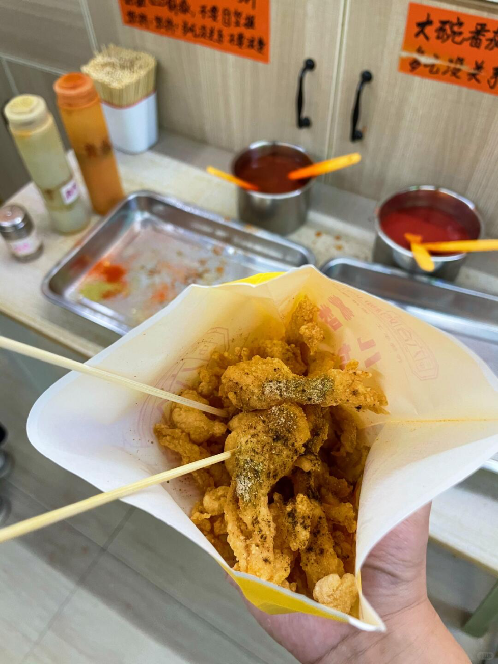 比手掌还大的一块鸡排,塞得满满当当的鸡柳,外皮脆得掉渣,鸡肉鲜嫩多汁。撒料台永远摆得整整齐齐,番茄酱、孜然粉等各种酱料可任意添加。
