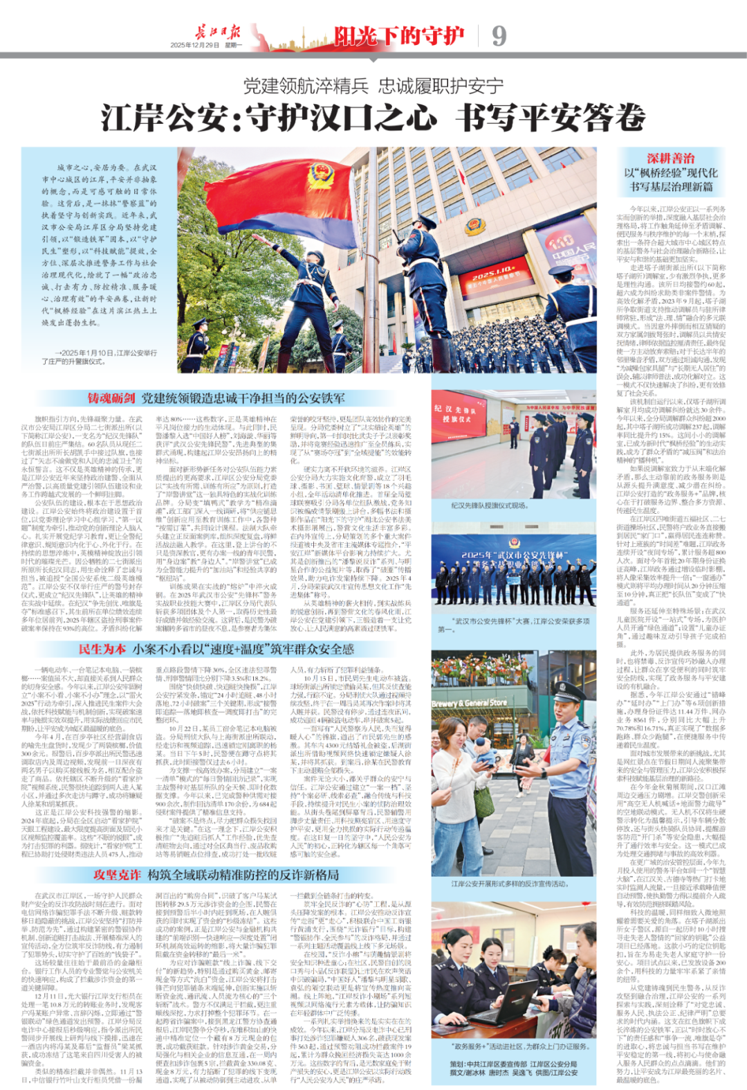 从党建铸魂到民生警务,从反诈攻坚到融合治理,江岸公安的一系列探索与实践,深刻诠释了“对党忠诚、服务人民、执法公正、纪律严明”总要求的时代内涵。这支在红色旗帜下成长淬炼的公安铁军,正以“时时放心不下”的责任感和“事争一流、唯旗是夺”的进取心,将忠诚与担当书写在维护平安稳定的第一线,将初心与使命融入服务人民群众的点点滴滴。他们的努力,让平安成为江岸最亮丽的名片、最温暖的底色。