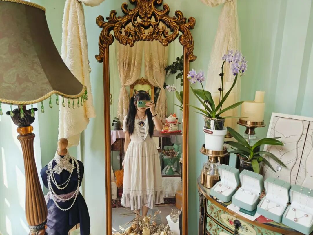 下午2点,汤梦婷和往常一样推开“梦境珠宝定制”小店大门,在门口落地雕花大镜前,举起手机拍下镜中的自己——“今日已上工”——她熟练地编辑文字、配图、发布朋友圈,像一句安静的宣告,也是她对手作事业庄重而温柔的仪式。