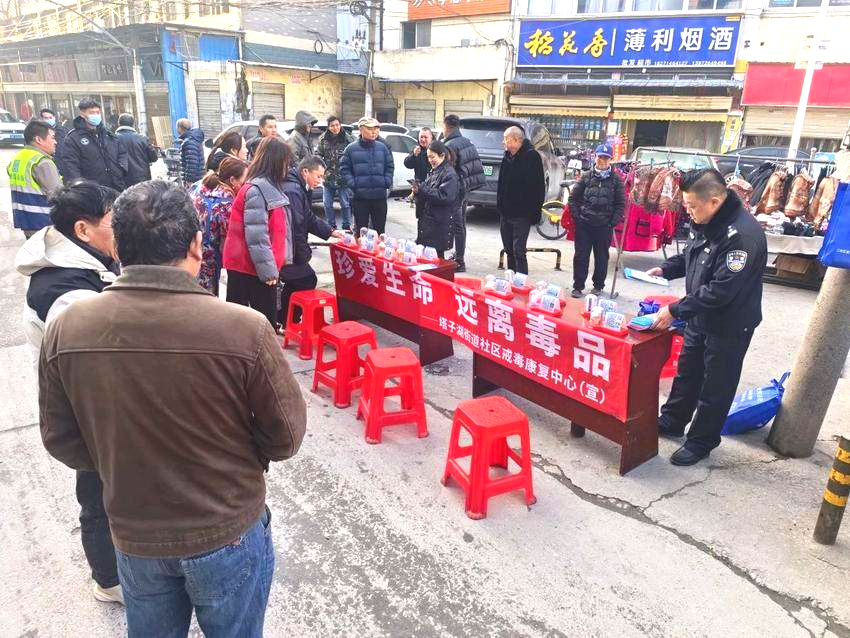 塔子湖街道金潭村联合多部门开展禁毒宣传活动,通过现场讲解及案例警示等方式,向居民普及毒品危害与防范知识,增强居民的识毒、防毒、拒毒意识。