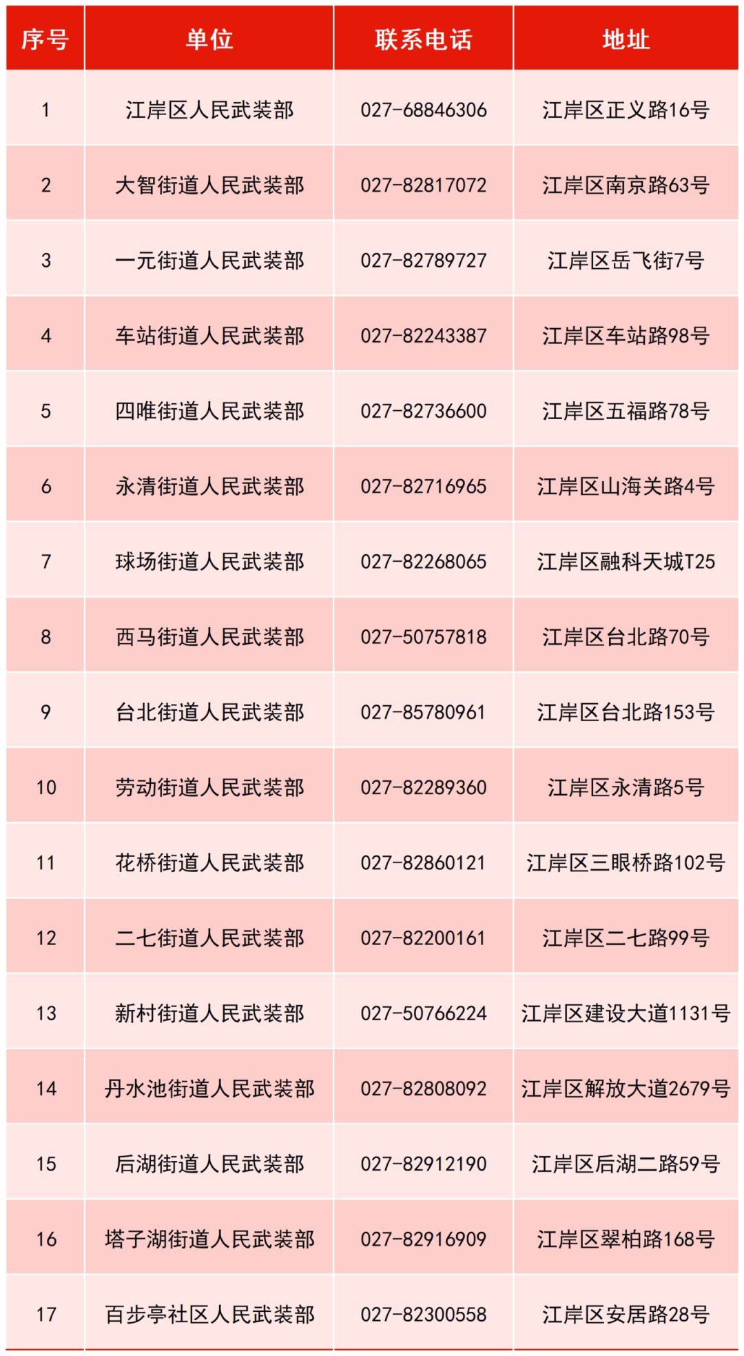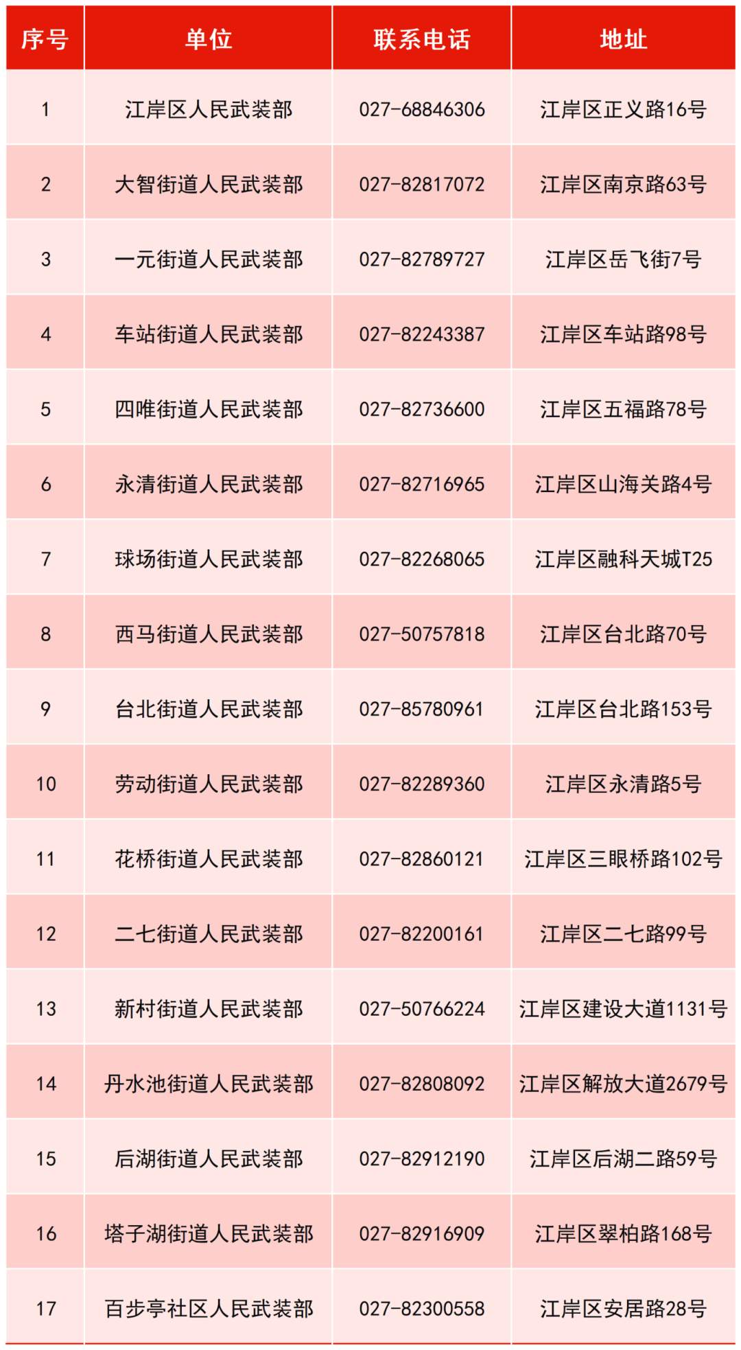 江岸区人民武装部和各街道(百步亭社区)人民武装部联系电话和报名地址: