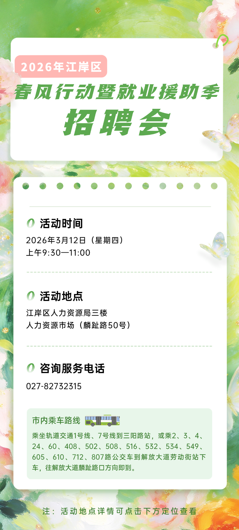 为认真贯彻落实习近平总书记关于促进高质量充分就业的重要讲话精神,按照市委、市政府一季度“开门红”十大行动有关工作部署,着力稳就业、稳企业、稳市场、稳预期,在武汉市人力资源和社会保障局的指导下,江岸区人力资源局、江岸区退役军人事务局将举办2026年“春风行动暨就业援助季”招聘会。