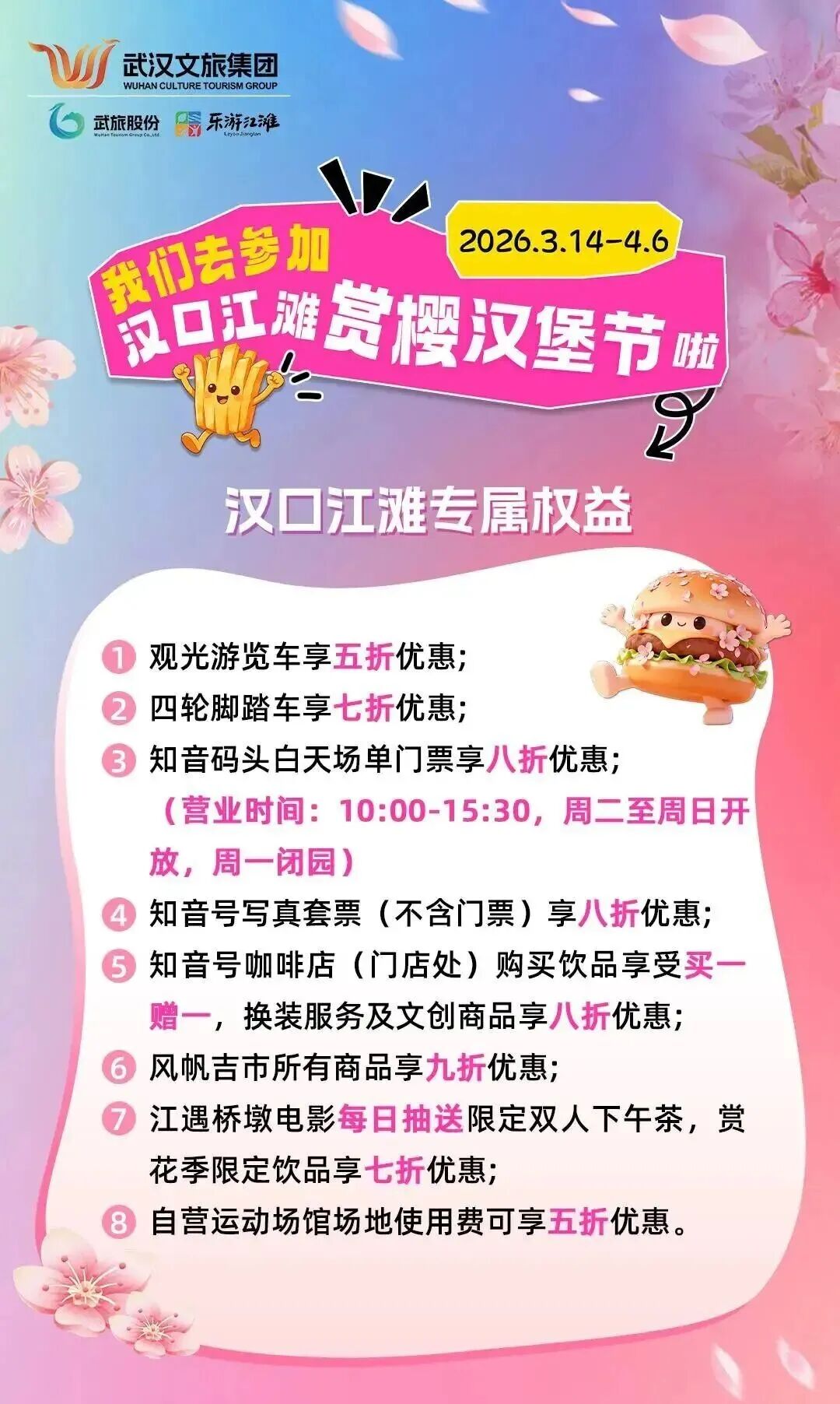 3月14日至4月6日在汉堡节商户购买任意单品,即可领取专属权益兑换券,畅享武汉三镇江滩观光车五折、咖啡买一赠一、知音号及文创产品折扣等多重优惠,实现“吃玩赏游”一站式体验。
