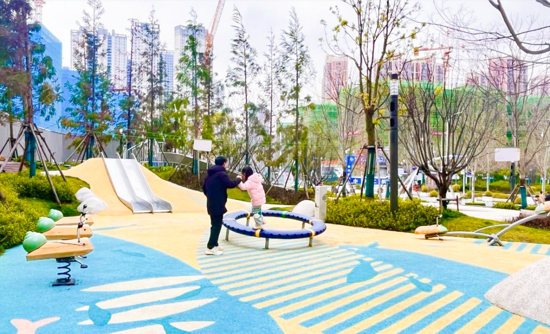 姚师傅是江西人,2012年在江岸区丹西城市更新片现代城小区买了房,退休后便来武汉带孙女。他回忆说,刚搬来时,周围还是大片的旧厂房和荒地。随着城市更新的推进,这里发生翻天覆地的变化。特别是近两年,沿百花一路打造的约700米长的漫滩公园和水滴公园相继建成,成了居民休闲娱乐的好去处。